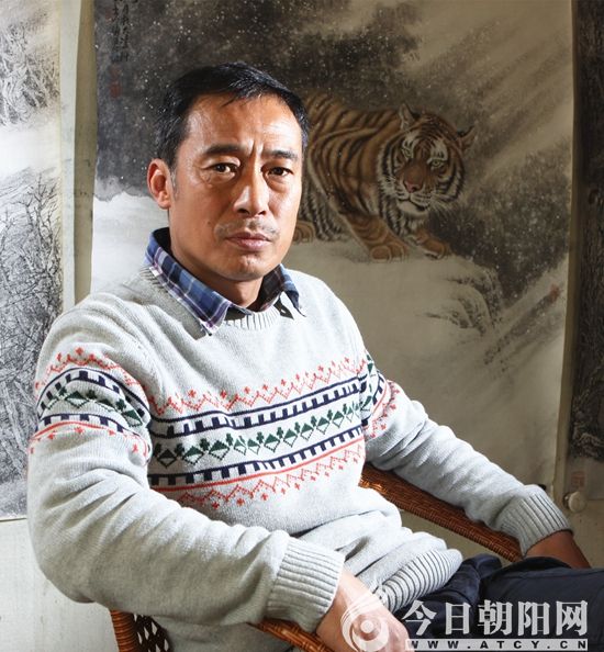 品讀欣賞伊海軍的作品,探索感悟他創(chuàng)作的審美情趣,首先要了解他早年與東北虎的淵源情結(jié)。在九十年代,伊海軍是個(gè)有故事的人。他生于遼西北票,成長于遼東本溪。他師從畫虎名家馮大中的得意門生、著名畫家邢世靖先生,學(xué)習(xí)“撕毛之法”畫工筆老虎,也得到過著名畫家宋雨桂的指點(diǎn)。早年間,他因觀察寫生老虎,被身后老虎咬傷,咬掉一個(gè)腳趾頭,在邢世靖和宋雨桂的呵護(hù)下他虎口脫險(xiǎn)保住了右大腿。一時(shí)間,國內(nèi)外近百家媒體對本溪虎口奪人事件進(jìn)行報(bào)道及轉(zhuǎn)載,伊海軍的故事與他的工筆虎一起飛入尋常百姓家。從此,與虎結(jié)緣,他一反常態(tài)地拋棄了昔日以大為小,簡略畫毛的傳統(tǒng)畫虎法,并對恩師的“撕毛之法”畫虎技藝進(jìn)行了大膽探索和發(fā)展,從用筆、賦彩和肌理架構(gòu)上逐步確立了“伊氏破筆撕毛法”語言符號(hào)。其作品呈現(xiàn)給讀者的是一幅幅洋溢著浪漫主義色彩的天倫之樂、離別思緒和叱咤風(fēng)云的英雄主義形象。