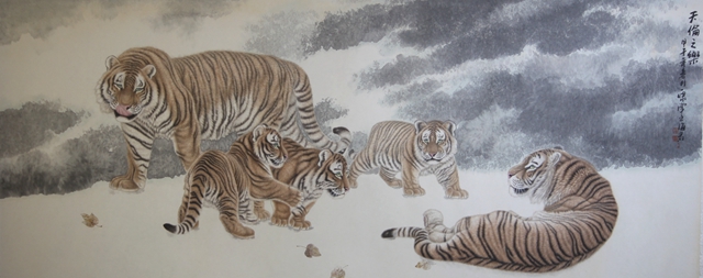 畫虎,似在形,貴在神,妙在景,絕在韻,難在骨。伊海軍的作品實(shí)現(xiàn)了有骨有肉,氣足韻豐?!短靷愔畼贰肥且梁\娂鬃幽晷伦?,作品大氣渾厚,精妙沉雄,結(jié)構(gòu)精美舒展,處處洋溢著和諧溫馨的天倫氛圍,這是他二次變法以來最難得的佳作,他成功打破了工筆與寫意的壁壘,營造出自然界濃郁的生活氣息。這是思變的結(jié)晶,這是傳承的果實(shí),印證了畫家的聰慧和學(xué)養(yǎng)。畫面雌雄兩只成年虎一臥一立,細(xì)筆行云流水,清晰嫻熟,結(jié)實(shí)韌性,減少了霸氣,增添了和氣;老虎的肌肉和骨骼表現(xiàn)的真實(shí)生動(dòng),肢體曲凹突兀處,隱顯虎之骨骼,展現(xiàn)虎在不同姿態(tài)下的神韻。三只幼虎敦厚可愛,憨態(tài)可掬,栩栩如生。骨肉關(guān)系明晰可見,舐犢之情躍然紙上,真正讓讀者感受到了筆筆有親情,筆筆有意趣,形象展現(xiàn)了美獸的溫情畫面?;D背景配置是近期伊海軍作品實(shí)現(xiàn)突破的新課題。他化繁為簡,以潑墨為主,渲染墨韻,突出主題,地上幾片楓葉與朦朧遠(yuǎn)景呼應(yīng),虛實(shí)對比,濃淡對比,繁簡對比都相得益彰。這幅作品的成功并非偶然,一方面源于伊海軍長期對東北虎環(huán)境的關(guān)注。他的創(chuàng)作素材完全來源于生活,他曾兩度在沈陽、秦皇島、牡丹江橫道河子寫生,在野生動(dòng)物保護(hù)基地觀察東北虎生活習(xí)性,骨骼形狀。另一方面是他對藝術(shù)的感悟和筆墨的提煉。他認(rèn)為,感受的真實(shí)比實(shí)物本身的真實(shí)更可貴。他在創(chuàng)作中,常常把虎爪,虎胯和虎的五官進(jìn)行合理有效的放大夸張,使藝術(shù)高于生活,讓讀者真實(shí)感受到他作品中的老虎遠(yuǎn)比大自然中的真虎更美麗,更健壯,更威武。
