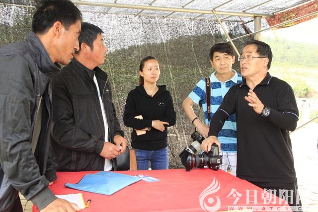 省紀(jì)實(shí)攝影協(xié)會(huì)主席武永明(右一)為凌源熱水湯村百合谷管理人員講解園區(qū)遠(yuǎn)景規(guī)劃,希望他們能把百合谷創(chuàng)辦成一流的攝影基地,讓更多的人來這里采風(fēng)。