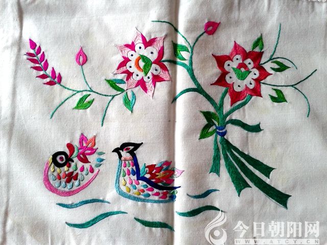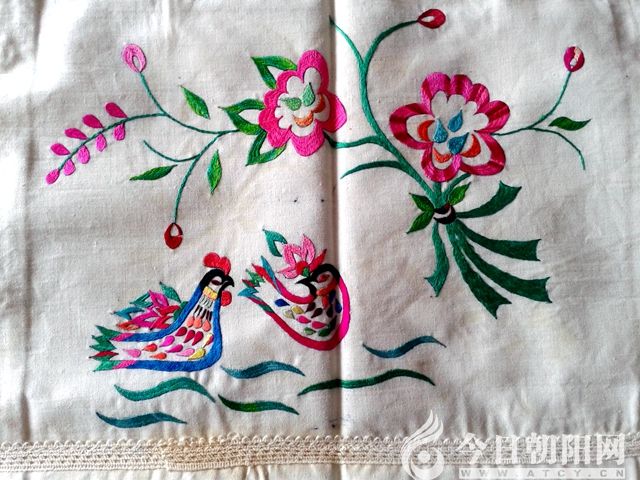 這幾頂枕頭皮和門簾的布料沒有什么珍貴的,就是母親出嫁那個(gè)年代特有的青黑色粗布。要說它們珍貴,主要在枕頭頂和門簾腰子,母親用絲線一針針扎出來的圖案。是的,我問母親這圖案是怎么繡上去的,母親說那不叫繡,那叫“扎”,就用縫衣服的針一針一針的扎。圖案有花,有草,有蟲,有鳥,還有山有水,那線的顏色紅彤彤,金燦燦,綠盈盈,藍(lán)汪汪,過了幾十年了都沒有掉色。那顏色要多肉頭就有多肉頭,那圖案要多故咚就有多故咚,我想這也應(yīng)該算是民間藝術(shù)了吧,不知算不算“遼繡”?