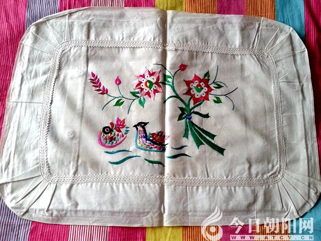 后來,母親也住樓了,當(dāng)年的箱子柜也都留在了老家,這幾頂枕頭皮和門簾也留在了老家??汕皫滋?,母親回老家又把它們給帶來了,其中有一對(duì)扎的“洋枕”,說要送給她的孫子和外孫女每人一個(gè)。
