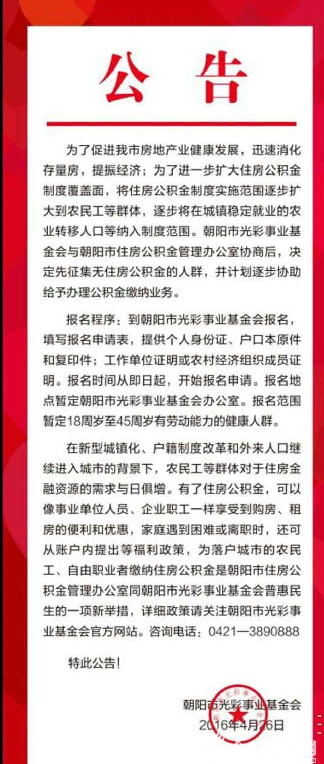 在現(xiàn)場(chǎng),小編還看到了一則由朝陽(yáng)市光彩事業(yè)基金會(huì)發(fā)布的《公告》,大意是:基金會(huì)與朝陽(yáng)市住房公積金管理辦公室協(xié)商,決定先征集無(wú)住房公積金的人群,并計(jì)劃逐步協(xié)助給予辦理公積金繳納業(yè)務(wù)。有需要此業(yè)務(wù)的市民,請(qǐng)持有效證件到基金會(huì)辦公室報(bào)名。辦理相關(guān)手續(xù)后,“農(nóng)民工等群體” “可以像事業(yè)單位人員、企業(yè)職工一樣享受到購(gòu)房、租房的便利和優(yōu)惠”(詳情可打電話0421—3890888咨詢)。