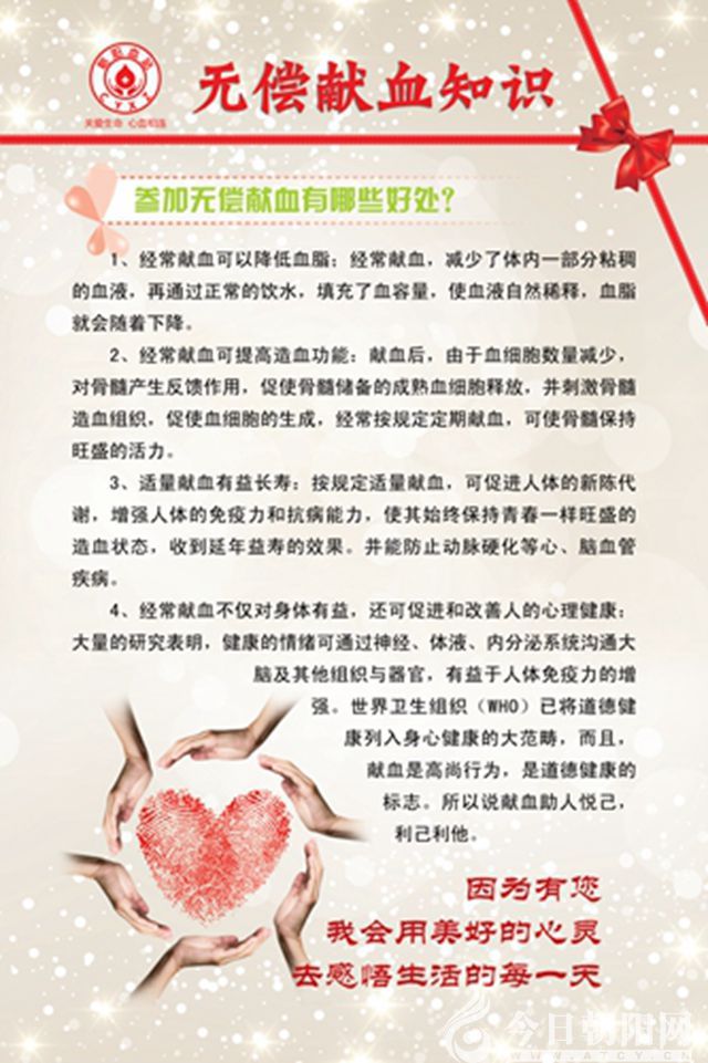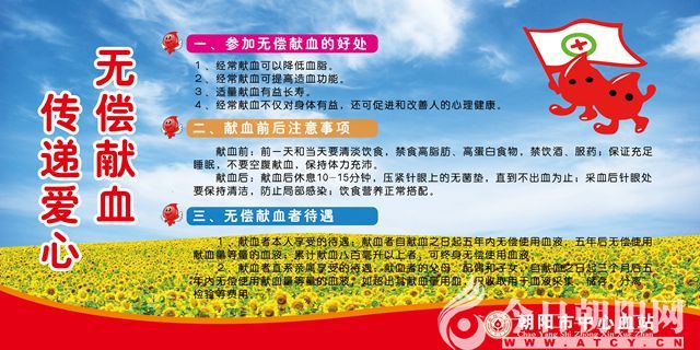 本次市直機關2016年無償獻血活動將于11月29日正式啟動,截止12月末結束。對報名人數(shù)比較少的機關單位,要求在每周二或周四到市中心血站、政府門前獻血屋、珠江獻血屋就近參加活動;對報名人數(shù)較多的單位,市中心血站將上門開展服務。希望廣大機關干部職工積極參與,尤其是黨員干部應發(fā)揮黨員先鋒模范作用,率先垂范,感召更多的人參與、支持和關心無償獻血事業(yè),讓“捐一份熱血,獻一片愛心”的社會公益意識深入人心,推動朝陽市無償獻血事業(yè)的健康、持續(xù)、穩(wěn)定發(fā)展,進一步提升朝陽市文明程度,為構建和諧美麗健康的新朝陽做出貢獻!