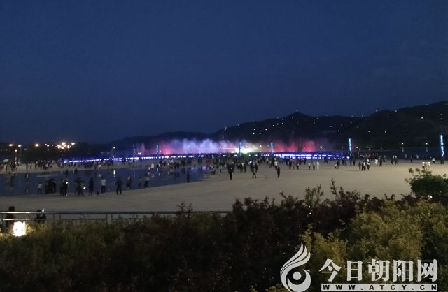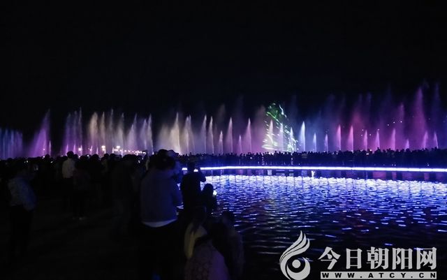 隨著人流前行,看到廣場上多出來一個小音樂噴泉。小噴泉沒什么特別的,很普通,正在噴放。半個小時后,小噴泉噴放結(jié)束,大噴泉開始噴放。大噴泉跨在公園的湖面上,離小噴泉也就七十米左右,長度一百八十米左右,跨度差不多五十米左右,最高水柱能升空一百米。大噴泉上映水幕電影,水幕最高可達(dá)20余米,寬40米左右,播放的畫面具有很強(qiáng)的立體感和空間感,讓人目不暇接、非常震撼。伴隨著悠揚(yáng)頓挫的音樂旋律,讓人產(chǎn)生一種虛無縹緲、夢幻般的感覺。湖中游船、游艇往返穿梭,為龍?jiān)春衷鎏砹艘坏里L(fēng)景。水幕電影的“喀左歡迎您”五個大字,拉近了與城外游客的心理距離。播放的內(nèi)容豐富多彩,展示了喀左的街容建筑、歷史文化、特產(chǎn)等等,還有體育運(yùn)動的精彩場面和京劇臉譜、各種動物肖像等等,用文字是描述不完的。