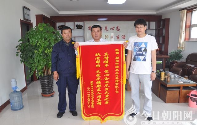 5月24日,遼寧省朝陽市龍城區(qū)邊杖子鎮(zhèn)敬老院院長孟憲勛和鎮(zhèn)民政干部一起,把一面寫有“真情援手、愛心企業(yè)盡顯大愛之舉;扶老幫困,大愛無疆彰顯人間真情”字樣的大紅錦旗,送到了朝陽市瑞森生態(tài)養(yǎng)殖有限公司董事長宋玉祥手中,以極其樸素的方式,表達了發(fā)自內(nèi)心的感激之情!