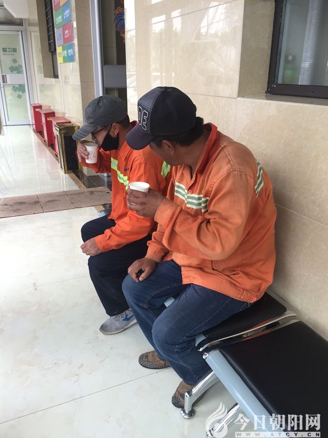 兩位環(huán)衛(wèi)工人坐在醫(yī)院特意開(kāi)設(shè)的“愛(ài)心服務(wù)站”長(zhǎng)廊的椅子上,工作人員熱情地為他們倒著熱水。環(huán)衛(wèi)工人喝著熱水,快樂(lè)地交談著。他們看似有些靦腆甚至害羞,但他們內(nèi)心的快樂(lè)依然洋溢在整個(gè)畫(huà)面。
