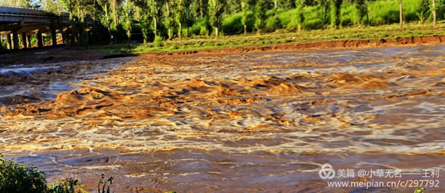 這場透雨,十多年不見的洪水相伴而來,也給人們帶來了又一次的視覺盛宴。再一次展示了大自然獨一無二的粗獷力量與獨特魅力,滾滾波濤以排山倒海之勢撲面而來,家鄉(xiāng)祖母河的洪水與黃河之水天上來競相媲美!