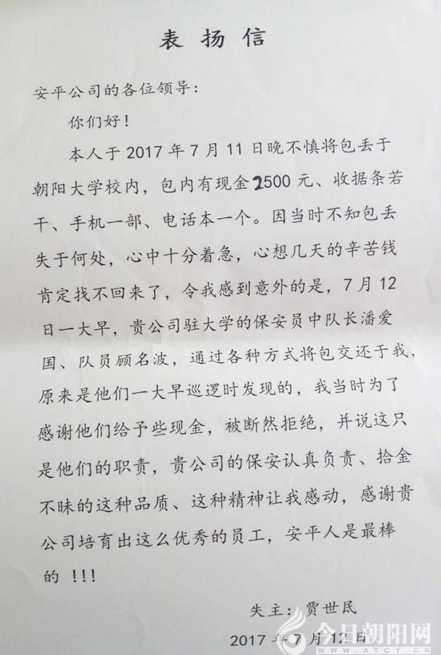 ——記遼寧朝陽(yáng)安平集團(tuán)保安員拾金不昧的感人故事