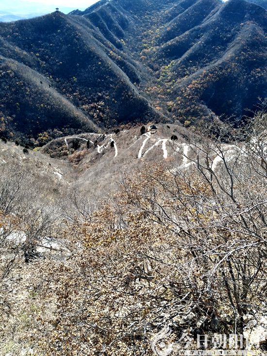 我是給四位大姐拍照的,看見可以入鏡的景色就喊她們站好留影??墒亲蛱祜L(fēng)大,估計(jì)很多美好的東西多被打劫,曾經(jīng)讓游人趨之若鶩如醉如癡的秋葉如今再也難以見到。山巖裸露的地方露出山石的白,如同一幅幅天然的水墨丹青,像丹青妙手皴染上去一般。山上的植被多是一叢叢耐寒耐旱的榆樹毛子。因?yàn)槿~子隨風(fēng)落盡,看上去灰得了無生機(jī)。天氣雖然好過昨天一萬倍不止,一碧千里,晴空麗日的,只是山風(fēng)又起來了,哪里都聽得見陣陣的松濤聲。葉子紛紛起落,不見綠色,不見流水,行人寥寥,山寒水瘦心生寒意。只有路邊的雜樹生花,聊可以慰藉心靈。山回路轉(zhuǎn)看到吉象湖,拾級(jí)而上,過橋洞憑欄俯瞰,眼前圍了一灣淺水。難得對(duì)面湖邊竟然還有一只松鼠來湖邊飲水。面對(duì)游人的驚喜,它顯得如此淡定,飲足了水,才反身消失了。由此爬山有兩條路,一條是柏油路,走車走行人,而另一條就是沿路修建的一條木頭棧道。隨山勢(shì)蜿蜒錯(cuò)落起伏,應(yīng)該是夏季游人喜歡的避暑捷徑。