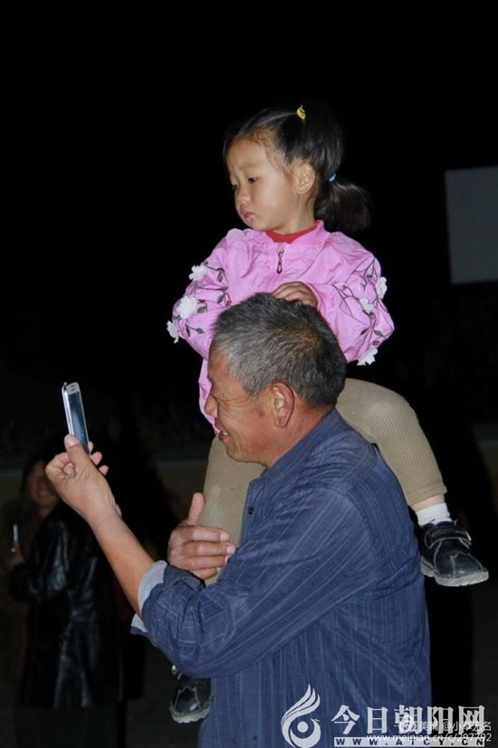 裂山梁村的一老一小觀眾,小孫女騎在爺爺?shù)募缟?,爺爺掏出手機搶拍演出時的精彩瞬間,留下了美好的記憶!