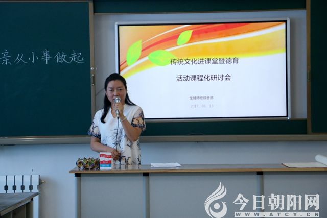 6月13日,集中進行了研討、交流活動。開展了“國學進課堂暨德育活動課程化研討會”。來自全區(qū)中小學的德育副校長及部分班主任,以及朝陽市教師進修學院德育部相關人員近百人參加了此次研討活動。