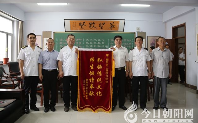 衛(wèi)生監(jiān)督局的領(lǐng)導(dǎo)為朝陽工程技術(shù)學(xué)校贈(zèng)送了一面錦旗。