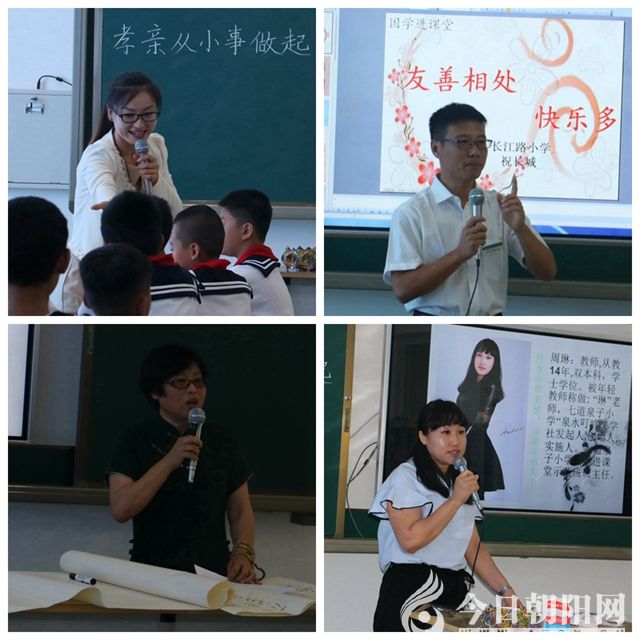 長江路小學(xué)祝長城老師根據(jù)《六尺巷》的故事做了體驗(yàn)式德育活動(dòng)課《友善相處快樂多》,聯(lián)合小學(xué)張立杰老師根據(jù)訓(xùn)蒙文《弟子規(guī)》做了體驗(yàn)式德育活動(dòng)課《孝親從小事做起》,西大營子鎮(zhèn)中心校德育副校長溫靜做了《品味國學(xué)經(jīng)典 增長人生智慧》的經(jīng)驗(yàn)介紹,七道泉子小學(xué)周琳老師做了《傳承中華美德 潤澤幸福人生》經(jīng)驗(yàn)分享。
