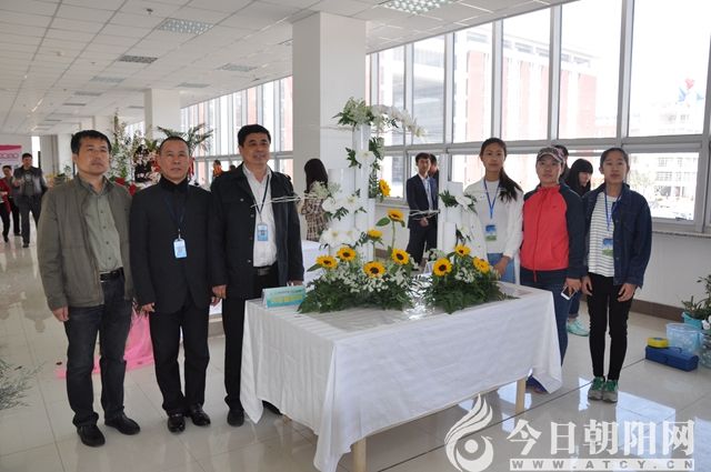 學(xué)校領(lǐng)導(dǎo)與獲得2016年遼寧省職業(yè)院校中職組“藝術(shù)插花”賽項第一名的曹洋和指導(dǎo)教師在學(xué)生獲獎作品前合影