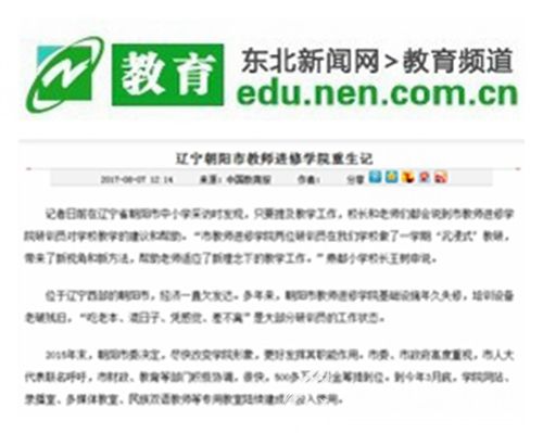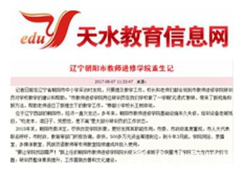 春植嘉木,秋有果香。2017年8月7日,正值立秋,中國(guó)教育報(bào)“應(yīng)時(shí)”發(fā)表了記者劉玉采寫(xiě)的文章,題目是《遼寧朝陽(yáng)市教師進(jìn)修學(xué)院重生記》。當(dāng)日,中國(guó)教育新聞網(wǎng)、東北新聞網(wǎng)、中國(guó)校長(zhǎng)網(wǎng)、中國(guó)搜索教育網(wǎng)、天水教育信息網(wǎng)等網(wǎng)站紛紛予以轉(zhuǎn)發(fā),在行業(yè)內(nèi)迅速引起強(qiáng)烈反響。