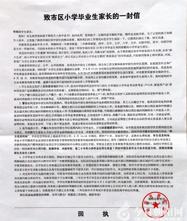 3.在外地讀小學(xué),戶籍在局直初中招生學(xué)區(qū)范圍內(nèi)的小學(xué)畢業(yè)生,計劃回原籍就讀初中的,由市教育局審核后按學(xué)區(qū)安排到指定初中招生。回原籍學(xué)生要在6月份小學(xué)畢業(yè)前到就讀小學(xué)完成一項重要工作:即找到學(xué)校學(xué)籍管理員,利用學(xué)校學(xué)籍系統(tǒng)網(wǎng)絡(luò)打印出“學(xué)生信息明細(xì)”,并在信息明細(xì)表上蓋就讀學(xué)校公章。8月14-16日期間,攜帶戶口本、家庭房產(chǎn)證、近期水電費收據(jù)、學(xué)生信息明細(xì)、畢業(yè)小學(xué)學(xué)籍或畢業(yè)證或綜合素質(zhì)評價手冊等材料到市教育局基礎(chǔ)教育科審核登記,填寫《朝陽市義務(wù)教育階段學(xué)校自主招生申請表》,市教育局按其戶籍和家庭住址指定學(xué)生到相應(yīng)初中辦理自主招生手續(xù)。學(xué)校自主招生文本審批手續(xù)及網(wǎng)上操作辦結(jié)后,由招生學(xué)校匯總后統(tǒng)一到市教育局辦理學(xué)籍。英德學(xué)校、向陽學(xué)校、第二十中學(xué)小學(xué)畢業(yè)生符合局直7所初中招生條件且不在本校直升的,按照回原籍招生辦法升入初中。