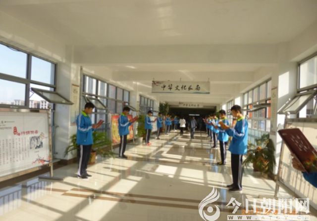 我原本以為朝陽工程技術(shù)學(xué)校歸屬于理工類,或許以學(xué)習(xí)數(shù)理化和專業(yè)技術(shù)為主。但是,當(dāng)我們走進(jìn)教學(xué)大樓,呈現(xiàn)在眼前的卻是充滿中華民族璀璨文化氛圍的文化長廊,聲聲入耳的也是傳承5000年的經(jīng)典之作:弟子規(guī)、千字文、三字經(jīng)、百家姓、大學(xué)、中庸、孟子……我們輕輕走入每一個(gè)教室,抑揚(yáng)頓挫、鏗鏘有力的誦讀之聲縈繞于耳。幾十年來,我印象中的初、高中晨讀,大都是外語或語文,可是在朝陽工校(農(nóng)校),每一個(gè)教室里的學(xué)生,都在老師的帶領(lǐng)之下高聲誦讀著國學(xué)經(jīng)典。