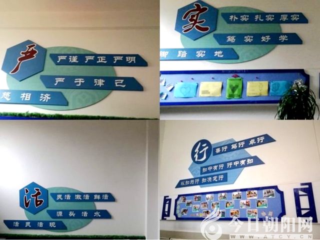 學校積極向上的教風學風,醒目的大字粘貼在校園樓梯拐角的墻壁上,時刻提醒著教師和學生當以“嚴”“實”“活”的教風和“勤”“思”“行”的學風自勉、自律。