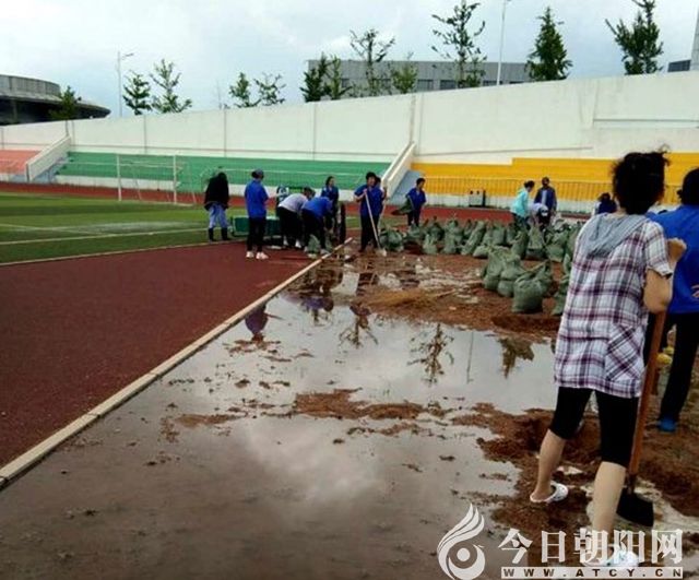 7月6日晚間,朝陽突降罕見大雨,給交通以及公共設(shè)施造成了很大損失。朝陽師專體育場地下水井反水,大半個場地被糞便污染。為了不影響使用,雨剛停,師專物業(yè)經(jīng)理即組織全體物業(yè)人員,用水泥袋裝沙子做防水堤,大家挽起褲腿,顧不得腳下的糞便水,一心想著為學(xué)生們保護(hù)好體育場。