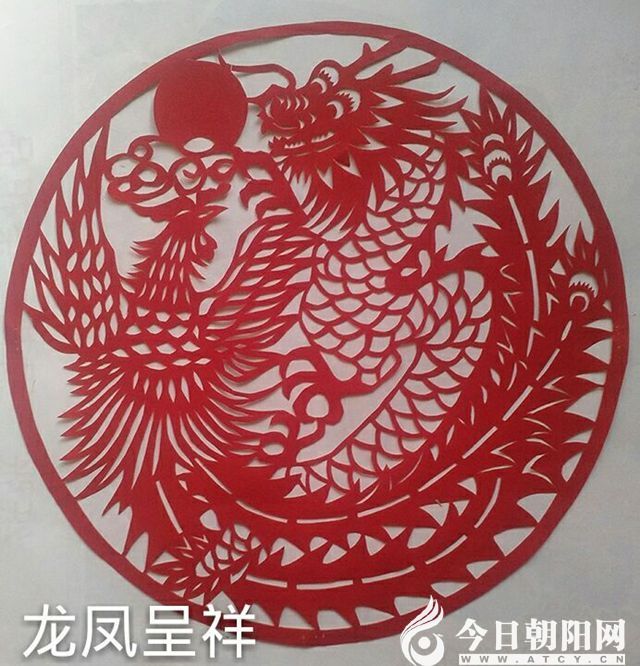 民間剪紙取材于民間。朝陽剪紙的主要內(nèi)容是山水花鳥、禽獸魚蟲、今古人物和生活場景。然而,她們并不滿足一般的描繪,常為自然之物賦予新的生命,故往往寓物寄情或取諧音代表一定含意,借自然之物表達(dá)自己對美好事物的贊譽(yù),對幸福生活的憧憬。如,常見的“梅蘭竹菊”,被喻為理想人格的寄托;“雞”自古被看做是文武勇仁信即五徽之禽,雞冠與官同音視為官祿;“雄雞啄蝎”又被認(rèn)為是避邪驅(qū)災(zāi)之意;“鴛鴦臥蓮”一句是甜蜜愛情和美滿婚姻的表徽;“連年有余”,“喜上眉梢”即用其諧音表達(dá)對幸福生活的美好愿望;“鯉魚跳龍門”則代表了對人生前途的祈求。其例不勝枚舉。此外,還有民間傳說和戲劇人物等。