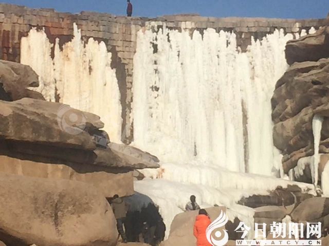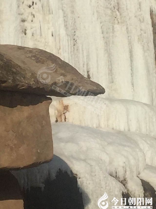 如果說(shuō)這里的巨石和冰臼有些冰冷的話,那么加上水流瀑布的變化,這里則變得幾分生動(dòng)和鮮活。上個(gè)世紀(jì)六七十年代,為了集聚這里的山泉水,大荒村在這巨石滿溝的山澗間,筑起一道水壩。無(wú)意間,又增加了一道奇觀。經(jīng)過(guò)多年淤積,水壩里的水只能滲出于黃沙之下。積滿的泉水,從石縫中瀉出,給蒼涼的石谷增添了些許靈氣。到了冬天,這些滲出的泉水,突然變得不同尋常。滲出的水流,漸漸積淀于石壁上,越積越厚,越掛越長(zhǎng),竟然神奇地生長(zhǎng)出一簾冰瀑來(lái)。瀑掛之長(zhǎng),色澤之白,如銀似玉,十分壯觀。這是大自然與人工的共同杰作。