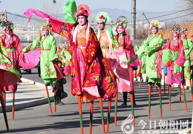 龍城區(qū)聯(lián)合鎮(zhèn)大三家村秧歌隊的40位高手,腳上綁著清一色的長腿高蹺,讓人不得不仰視。這邊鑼鼓一響,那邊立即聞聲起舞,迅即呈現(xiàn)出“服飾美,秧歌浪。旱船疾,高蹺狂”的動人場面。