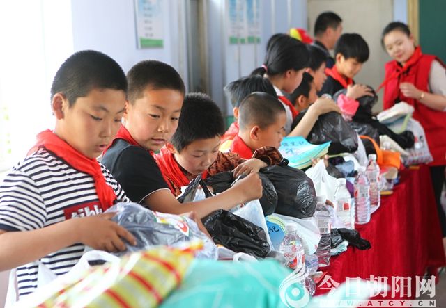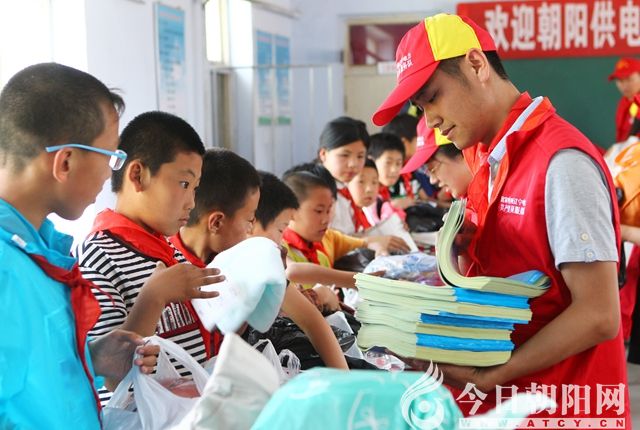 志愿者給貧困孩子發(fā)放學(xué)習(xí)用品