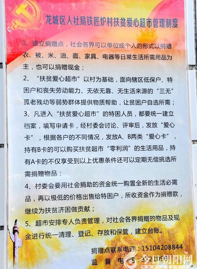 龍城區(qū)人社局與七道泉子鎮(zhèn)鐵匠爐村是幫扶對子,為使村民們早日過上富足甜美的好日子,該局黨員干部多措并舉,熱心幫助村民增收致富。“扶貧愛心超市”以村為基礎,面向轄區(qū)低保戶、特困戶和喪失勞動能力、無依無靠、無生活來源的“三無”孤老殘幼等弱勢群體提供物質幫助,降低貧困戶生活成本,讓貧困戶自選自需。