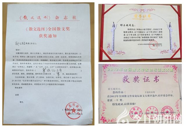 2013年5月,散文《綏中六記》獲得遼寧省作協(xié)和綏中縣主辦的全國(guó)征文大賽二等獎(jiǎng)。