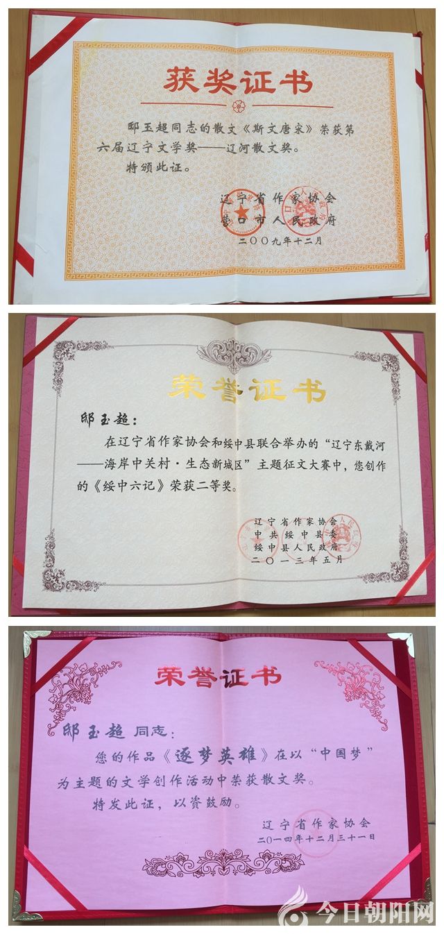 邸玉超是迄今為止,朝陽(yáng)市唯一有作品入選中考語(yǔ)文試卷的作家;唯一被全國(guó)名刊《小說(shuō)月報(bào)》《讀者》轉(zhuǎn)載作品的作家,唯一在全國(guó)名刊《散文》發(fā)表兩組作品的作家;唯一入選國(guó)標(biāo)教材·語(yǔ)文教師教學(xué)用書(shū)的作家;唯一被20多家圖書(shū)館自購(gòu)館藏著作的作家;唯一有作品入選《新中國(guó)散文典藏》的作家。