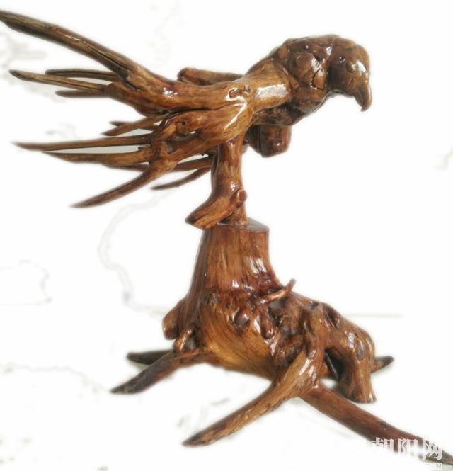 所謂根雕,就是以樹根的自生形態(tài)和它的畸變形態(tài)作為藝術(shù)創(chuàng)作對象,通過構(gòu)思立意、藝術(shù)加工及工藝處理,創(chuàng)作出人物、動物、器物等藝術(shù)作品,每位根雕藝術(shù)家都要經(jīng)歷這個認(rèn)識過程。2009年6月份的一天上午,休班的黃少偉到閻王鼻子水庫釣魚,偶然發(fā)現(xiàn)一塊有形有體樹根,左看右瞅,上面有一種一時讓人琢磨不透的感覺,便拿回家把玩。他琢磨來琢磨去,看出這塊樹根是花架子型,上面有個頭極像仙鶴,如果雕刻出一件“仙鶴花架展翅”的作品那是再好不過了,于是他開始試著做這件作品。沒有雕刻經(jīng)驗的黃少偉通過查閱資料和憑著自己對根雕藝術(shù)的極大興趣兒,經(jīng)過半個多月時間的加工制作,這件作品在他的手上誕生了。雖然初試雕技,盡管作品有些粗糙,但是還是神似和型似,是一件不錯的根雕作品。他從此愛上了根雕這門藝術(shù),視樹根如飯如水,一發(fā)而不可收。