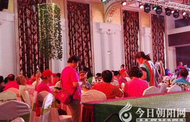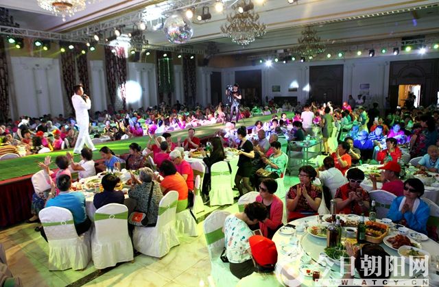 原來,這里正在舉行“大美朝陽·開啟老年旅游新風尚暨北京貴賓歡送會”。5天前,來自北京的370位游客(以中老年居多),興致勃勃地在素有“塞外龍城、三燕古都”美稱的朝陽度過了開心快樂的5天4夜。在一行人即將告別朝陽、返回京城的美好時刻,朝陽金華園餐飲集團董事長蘇萬民先生深懷“引客入朝、振興家鄉(xiāng)”的責任感,站在答謝貴客、繼往開來的新高度,決定出資舉辦本次盛會。