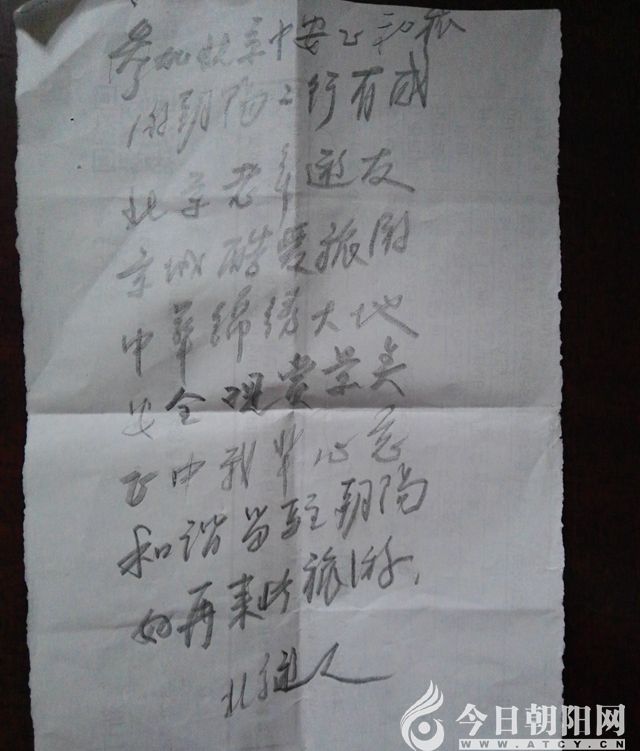 ——賓客反應與眾不同。官員講得好,小伙主持好,節(jié)目編排好,餐飲質量好,現場拍賣好,各種各樣的“好”疊加在一起,讓很多京華貴客的反應出人意料。其中,一位年已八十八歲高齡的老人,臨時撕下一塊《客房通知單》,在背面用鉛筆寫下了一首簡繁(字體)并用的藏頭詩《參加北京中安正和旅游朝陽之行有感》: