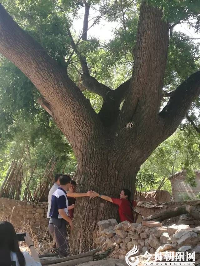 問到它確切的年齡,就連村里王家的后人也說不清楚。這位七十多歲的王家后人戴著草帽站在那兒,跟枝繁葉茂的大樹合影,他驕傲地叉著腰,笑一臉褶子,脫落的門牙露出黑洞洞,看著倒像樹的長輩,可實際上,樹比他的祖宗小不了多少歲數(shù)。我們不知道樹的具體年齡,就想量一量它的腰粗,個子最高的人主動上來,兩個一米八五的大個帥哥,外加一個近一米七零的美女,三個人手拉手,才將把樹干合抱過來。樹太大了,就連樹頂上住的戴勝鳥看起來都是小小的,它們佇立在枝間,不仔細看,甚至很難發(fā)現(xiàn)這些美麗的精靈。