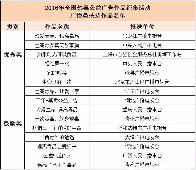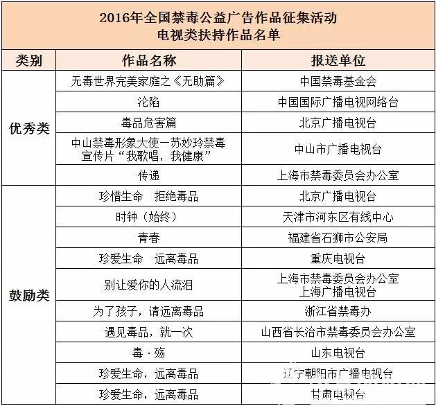 2016年全國禁毒公益廣告作品征集活動(dòng)評(píng)選出優(yōu)秀類、鼓勵(lì)類作品共30部,其中廣播類和電視類作品各15部。
