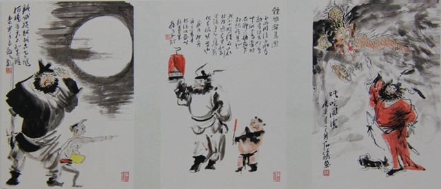 在中國民間,鐘馗是中國傳統(tǒng)文化中的“賜福鎮(zhèn)宅圣君”。如何讓中國民俗文化跟上時代的步伐,實現(xiàn)新的突破已經(jīng)成為蘇磊的首要課題。近年來,他首先從內(nèi)容題材上求寬求變,變單元為多元,更貼近老百姓生活,接近老百姓的精神訴求。在他的作品中,有的捉鬼鎮(zhèn)妖,有的賣酒開店;有的遛鳥戲童,有的抬頭見喜;有的張燈夜讀,有的踏雪夜巡;有的浩然正氣,有的招財納福。在這近百種題材各異的形象塑造中,他們或坐或臥,或醉或醒,或悠閑或凜然,或怒目或笑顏。特別是他的《百變鐘馗》長卷,寫盡了百姓美好愿望,抒發(fā)了作者內(nèi)心感懷和憤懣,表達了作者對美好生活的向往和正大氣象的精神寄托。這些作品題材廣泛,凡是能涉獵到百姓日常生活的內(nèi)容,都能納入蘇磊創(chuàng)作視野之中。他曾直言,“我的寫意人物作品都是為百姓大眾服務(wù)的,要接地氣,要充滿生活氣息,讓人們有一種強烈的靈魂依附感。”