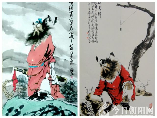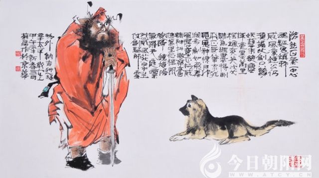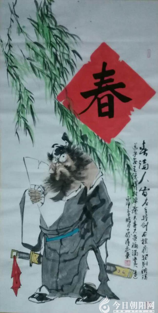 “寬衣解帶入洞房,恨福來遲嚇新娘。如此丑貌驚鬼神,有癡偏愛掛南墻。”這是蘇磊為《喜從天降》這幅作品配的一首打油詩。詩文詼諧,朗朗上口,信手拈來,毫無雕琢的痕跡。在《鐘馗送財》中蘇磊寫意了一組三驢馱寶、神犬領(lǐng)路、鐘馗押運的生動畫面,其背景是春風拂柳,燕雀歌唱。畫家即興題詩一首:“一輪紅日東方曉,春風滿面樂陶陶。踏遍青山人未老,鐘馗送財攜三寶。” 雖然其詩韻腳有待推敲,但卻充滿的文化自信和樂觀主義精神,為民俗藝術(shù)打開了一扇窗戶,恰似暖流入懷……“左手持劍右搖扇,招財納福送平安。呈德吉祥財源廣,恭喜大貴福滿堂。”“一身傲骨留芳世,千載英明照漢清。驅(qū)邪萬古傳佳話,懲惡扶正留美名。” 像這樣信手拈來的打油詩,在蘇磊的大部分作品中都能找到,詩已經(jīng)成為蘇磊寫意人物中不可或缺的一部分,已經(jīng)成為畫面的一種特殊符號和線條。
