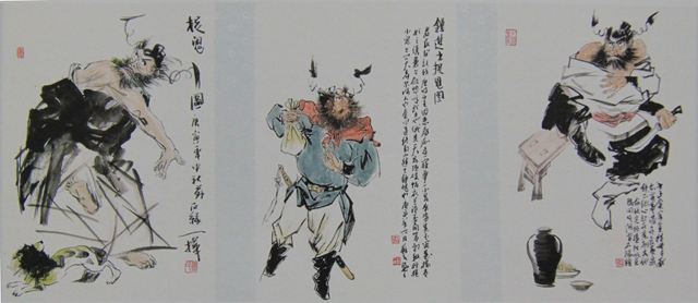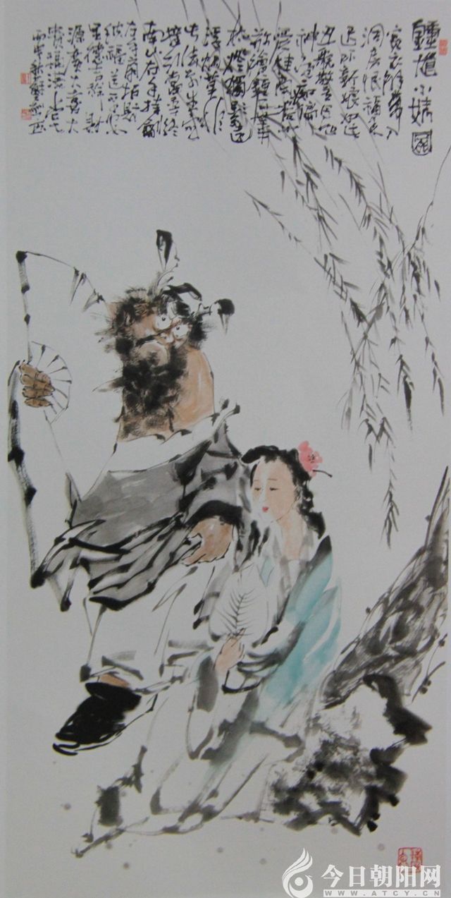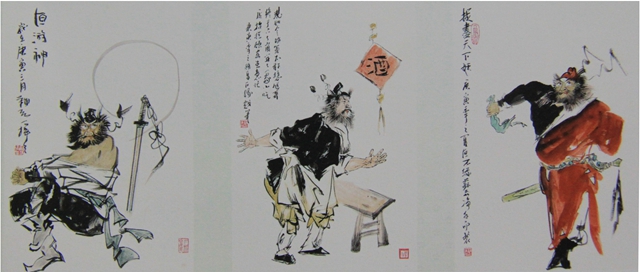 蘇磊的作品根植于傳統(tǒng),根植于民間,在百變之中追求人物的神韻。他多年來一直研究范曾的人物畫創(chuàng)作技法,汲取海派大師任伯年的筆意,借鑒沒骨宗師渾壽平的技法,探索出一條不與俗同的清新畫風。他的鐘馗作品既不同于民間塑造的“兇丑”形象,也不同于范曾筆下“國字臉”的濃眉大眼、英俊威武。他從范曾的鐵干銀勾風骨中逐漸走上了自由抒寫之路,心手交應(yīng),物我兩暢。其筆力勁健野逸,神采飛揚。他的這些鐘馗作品表現(xiàn)是寬泛多變的,線條或粗獷雄強,或細膩精致;敷色或驚彩絕艷,或清淡素雅水墨淋漓。既有當代水墨的印痕,又繼承中國民間原生態(tài)藝術(shù)的精華,充分體現(xiàn)了蘇磊在藝術(shù)上的獨到之處。