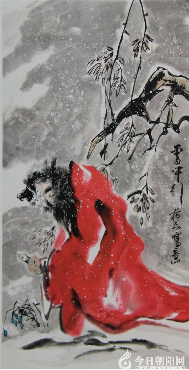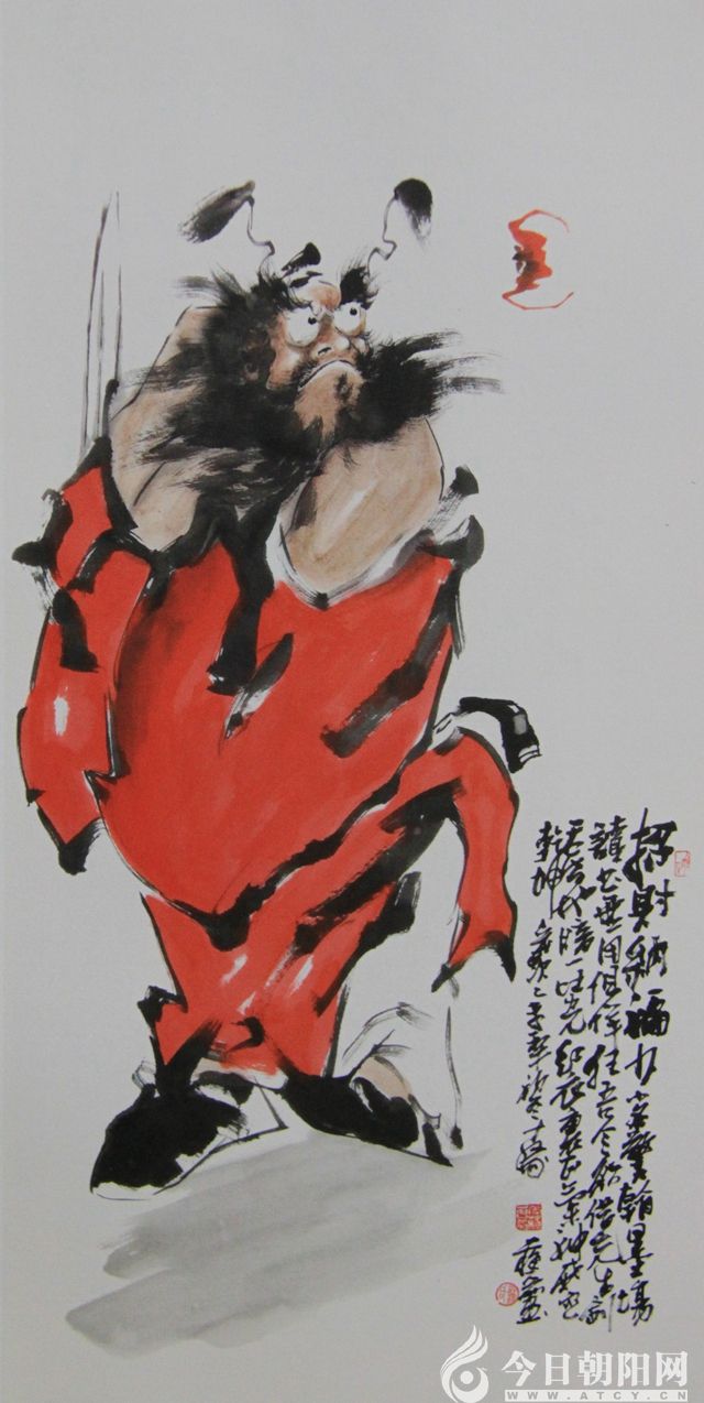《招財納福》這幅作品,堪稱蘇磊的經(jīng)典之作。作者飽含激情用粗狂的線條刻畫了一個栩栩如生的鐘馗形象:圓目劍眉胡須飛揚,手持利劍,身披紅袍,特別是那對環(huán)眼和“人字”嘴給讀者留下了深刻難以忘懷的印象。右上方紅色蝙蝠簡潔明快,線條遒勁有力。整個畫面展現(xiàn)出了鐘馗的傲然正氣,流露著人們驅(qū)邪納福的美好祝愿,那對坦露的雙肩,彰顯鐘馗心胸磊落不拍鬼邪的大無畏英雄主義精神;飄然的衣衫又顯現(xiàn)出鐘馗才華橫溢、滿腹經(jīng)綸?!堆┲行小愤@幅鐘馗畫作,線面和色彩對比鮮明,鐘馗頭部主色調(diào)為黑色,胡須、眉毛采用破筆撕毛法,線條硬朗爽快,清晰逼真,開臉精細生動;而身體部分主色調(diào)為紅色,衣服潑彩灑脫飄逸,層次鮮明,轉(zhuǎn)圜自若,一蹴而就。這幅作品造型嚴謹生動,背景凝練干凈,鐘馗的眼神、手勢、開臉、表情迥異,但皆傳神。即便是同一主題創(chuàng)作,他也不斷加以“變奏”,絕不會重復或抄襲自己。足見作者對人物表情的嫻熟把控。