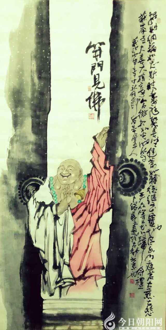 寫意大師潘天壽強調(diào),作畫要從實處入手,從虛處用盡。大寫意畫,執(zhí)筆宜稍高,運筆需懸腕,如書家寫行草書。蘇磊銘記大師教誨,秉承傳統(tǒng),不斷開拓民俗藝術(shù)新視野?!堕_門見佛》是蘇磊寫意人物畫中難得的逸品,這幅作品線條清爽明快,用筆濃重大氣,華滋渾厚,兩扇開啟的水墨大門,墨色純一豐富,一左一右平衡了畫面粗細線條與紅色色塊和衣服留白之間的強烈對比。作品濃淡、虛實、明暗、干濕、曲直、大小寫意等對比強烈。特別是人物造型生動準確,趣韻無窮。他以最少最簡潔的筆墨,表達了無限豐富的內(nèi)容,他用最少的憑借,表達了最豐富的佛家這一物象。