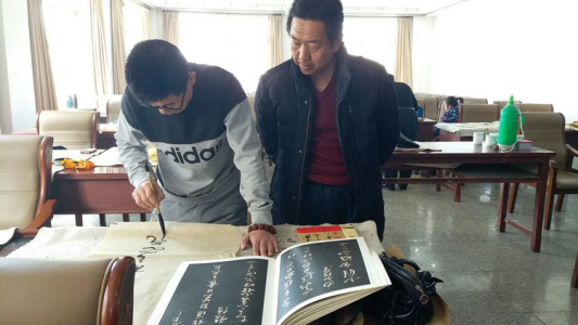書法研究生、副主席閆志遠(yuǎn)(左)在臨帖過(guò)程中積極與書友們交流心得,研討筆法。
