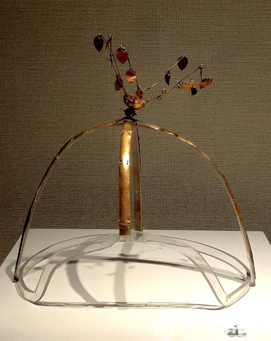 又如馮墓中出土的步搖冠,形制下為十字形的梁架,上為穿綴金葉的頂花,其冠前飾片有錘鍱的佛像。錘鍱是晉代發(fā)明的一種雕塑技法,其法是先做成所需要塑造物體的模型,然后用薄銅片披在模型上,錘打而成,稱為“錘鍱”。這是我國較古老的一種技術(shù),說明早期佛教的東傳和在北燕的發(fā)展。