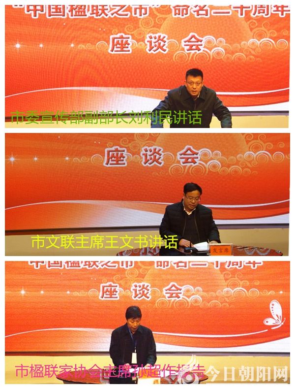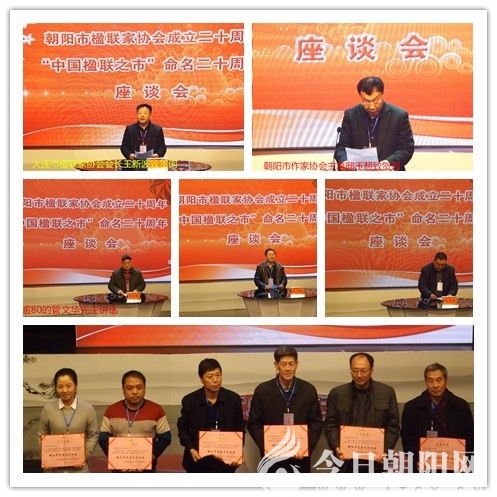 12月10日,遼寧省朝陽市楹聯(lián)家協(xié)會成立暨“中國楹聯(lián)之市”命名二十周年座談會在朝陽電視臺三樓演播廳召開。我作為協(xié)會成立之初及創(chuàng)建楹聯(lián)之市的親歷和參與者,心情非常激動!會上,市委宣傳部、市文聯(lián)、省楹聯(lián)家協(xié)會的領(lǐng)導(dǎo)和老顧問代表的講話,大連市楹聯(lián)家協(xié)會主席和朝陽市作家協(xié)會主席的賀詞,字字句句情真意切、震撼人心!