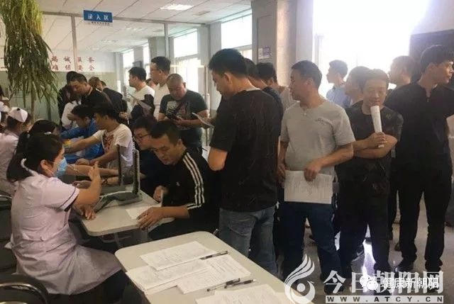 公司員工正在排隊(duì)填表、檢驗(yàn)、獻(xiàn)血