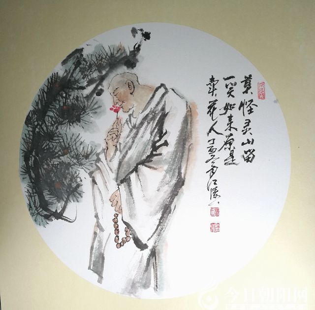 當組織者把畫作送給我時,我心懷忐忑地“瞥”了一眼,看到的是一幅“拈花和尚”水墨畫,配文“莫怪靈山留一笑,如來本是賣花人”。哦,我的前世原來是個和尚——竟然還拈著花!偷偷抬手擦了擦尚未出汗的額頭,忽覺心寬了許多:和尚就和尚吧,總比別的強多了!況且,這還是一幅意境深遠的畫作。