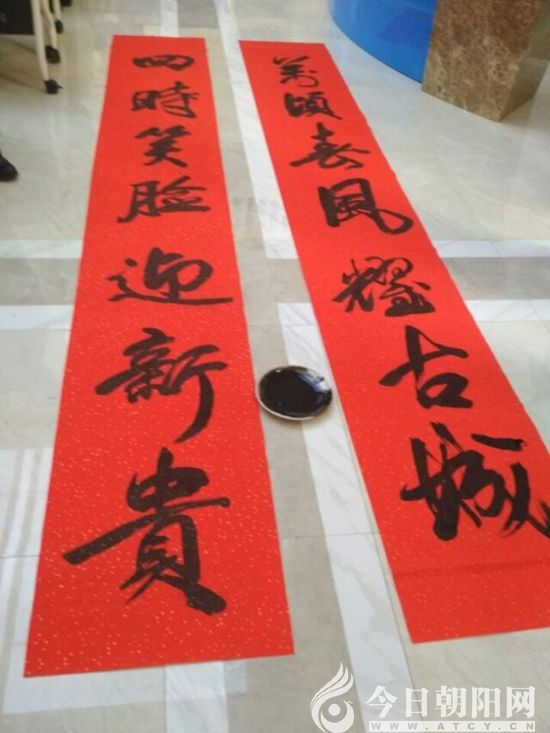 去年臘月十七,朝陽(yáng)市楹聯(lián)家協(xié)會(huì)組織書法家義務(wù)為市民書寫春聯(lián)。我隨王、潘兩位老師去求聯(lián),在那個(gè)銀行,看見辛向民、王萬(wàn)倉(cāng)、劉喜鵬等書法家正在奮筆疾書。那次給我印象最深的是辛向民老師,他揮動(dòng)如椽之筆,為銀行寫的“四時(shí)笑臉迎新貴,萬(wàn)頃春風(fēng)耀古城”十四個(gè)斗方大字。我感到震驚!高超的書法藝術(shù)讓我敬佩。