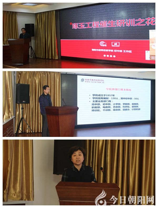 朝陽市教師進修學院初中部主任王作廷作了題為《琢玉工程催生研訓之花》的工作匯報,他從朝陽市初中的實際情況,到建立研訓基地和開展局直初中青年教師素質提升研訓系列活動這兩項創(chuàng)新工作的指導思想、目標、內(nèi)容、具體活動安排都作了詳實的闡述。
