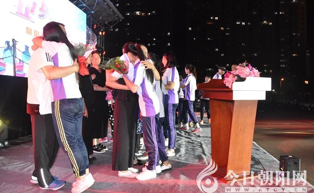 進入謝師環(huán)節(jié)后,現(xiàn)場多了幾許溫情而傷感的氣氛。全體高三教師站在舞臺上,臺下高三畢業(yè)生深情鞠躬。部分學生手捧鮮花,走向朝夕相處的老師,獻花、擁抱、合影留念。那一聲聲“老師您辛苦了!”充滿了感恩、敬意和無限眷戀。