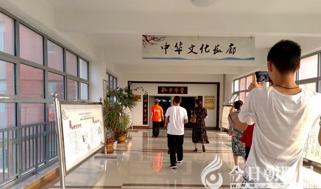 工校院內(nèi),噴泉如百花齊放,鮮花嬌艷惹人。一行人跟隨鄒濤來到樓上,兩位傳統(tǒng)文化老師身著旗袍鞠躬迎賓,中華文化長廊映入眼簾,一種濃厚的文化氛圍撲面而來。
