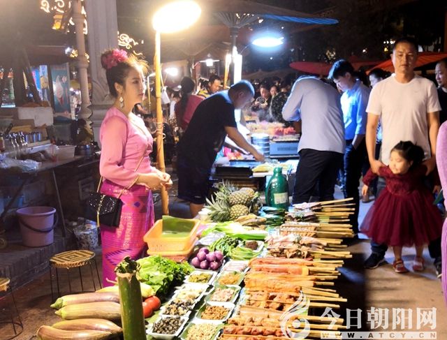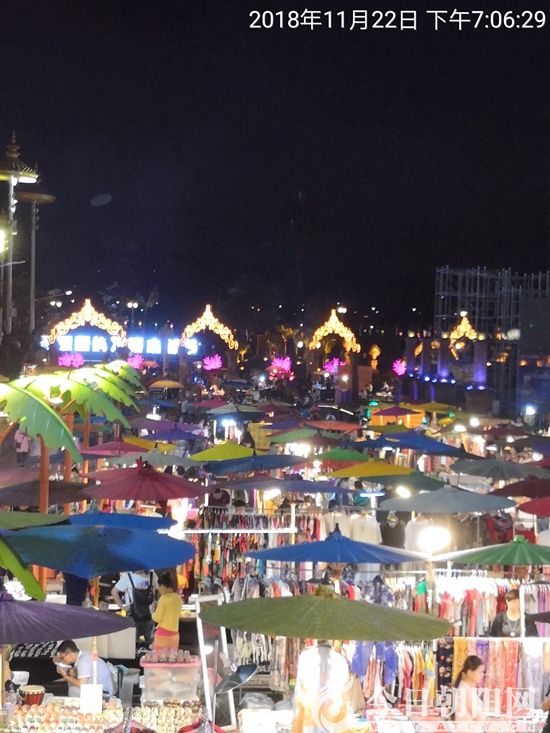 隨后,游人逐漸散開,有的一邊看節(jié)目一邊購物,有的約上朋友帶上家人去豐富多彩琳瑯滿目的美食攤享用瀾滄江(湄公河)沿岸,六國(guó)的風(fēng)味美食。泰國(guó)的手搖冰棍、雞蛋巴拉達(dá)。香脆的傣族豪崩,裹著香茅草烤瀾滄江魚蝦,新鮮的冬瓜豬烤肉,傣家泰式春涼拌,芒果飯菠蘿飯竹筒飯,炸蜂蛹竹蟲。還有來自全國(guó)各地的名吃,揚(yáng)州炒飯、江南香豆腐,四川抄手、湖南臭豆腐、東北煎餃,北京炸醬面。女孩子晚上不敢吃太多肉食,到水果攤買上來自五個(gè)國(guó)家和本地的水果、甜點(diǎn)。晶瑩剔透的石榴粒,金黃甜糯的菠蘿蜜,玲瓏精巧的小菠蘿,椰子凍、炸香蕉、榴蓮班戟,一盤盤端上桌當(dāng)下酒菜。再來一杯鮮榨果汁和男孩子豪飲啤酒瓶碰在一起,高喊著“水!水!水水水!”(水shui四聲,讀睡的音),這桌落下那桌又起。臺(tái)上笙簫歌舞,臺(tái)下“水!水!水水水!”此起彼伏。美食餐桌坐滿游客,告莊西雙景成了一片歡樂的海洋。來自全國(guó)的游人、瀾滄江(湄公河)兩岸參加慶典的嘉賓和西雙版納傣族同胞一起狂歡,斟滿杯中酒,齊聲“水!水!水水水!”共同慶祝西雙版納2018浪漫水燈節(jié)。